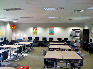 That'll help explain this huge room, with both a fabulous computer lab and classroom seating area. And I mean it's HUGE. I may have to invest in one of those Britney Spears mike's after all. :-) I took all of these photos with my ipod, so the quality is not as good as my camera! I think you'll get a good idea though. Are you ready? Let's start our mini tour...